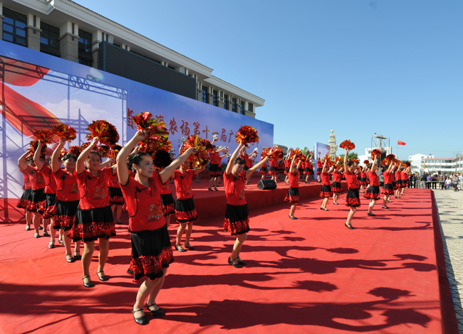 淮海城南居委会社区居民姜建英从一个孤独病人渐渐成为健身运动的热衷者、引领者,已跻身多年舞蹈教练的她,每天晚上准时到文化广场带领姐妹们传授技艺,健身跳舞。目前她旗下的舞友就有几百号人,每当音乐响起之时,每天正常参与健身的近百名男女老少随着音乐的节拍,在她和其他几位教练的带动示范下翩翩起舞,人们也在舞蹈的熏陶下,享受着现今美好的新生活,同时这一镜头也成为农场职工居民夜幕下流动的风景。