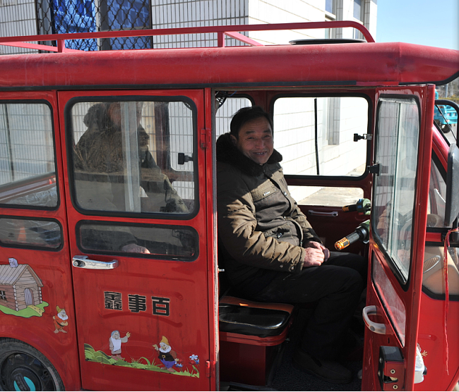 画面中的驾驶员是淮海农场四分场社区54岁的黄玉青,弱智又低收入的他,每月靠400元的低保维持着简单的生活。2017年农场组织科长林一高和四分场二十八大队队长王扣林与其结成精准帮扶对子后,他在获得帮扶的同时,也更是激发了黄玉青自主创业的动力。黄玉青每天开着一辆百事鑫电动三轮车,停泊在医院门前接客,在方便他人的同时,也为自己增加了收入。瞧,载着客人的黄玉青笑得是多么地灿烂。