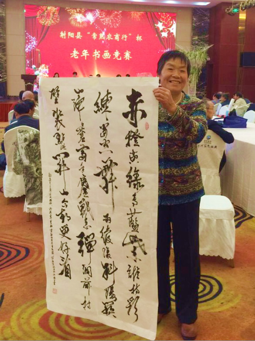 据了解,赵梅生原是江苏农垦淮海农场石油机械厂的退休职工,她不但能写一手潇洒的字,而且小篆、隶书、楷书、草书等书法样样精通,家中存有一卷一卷的各类书法作品;经她创作的人物肖像、山水画、素描等作品,家中堆成了一摞一摞的。对特别钟意、栩栩如生的绘画,她总是装裱起来,挂在大厅或是送给友人。无论是在上海普佗区阳光二居委书画协会出版的《晚霞余辉》书画作品选中,还是农场书画室陈列的精品展上,我们都可看到赵梅生的名字和熟悉的画,没有想到今年已是73岁的她,还能写画出如此逼真、如此飘曳的书法书画,真是看了令人叹为观止。2016年7月,赵梅生书写的小篆“勿忘抗日战争,颂扬民族精神,反对侵略占领,维护世界和平”排在了拾贝轩网络书法展第9名;同年10月,在射阳县老龄协会、县老龄办联合主办的射阳县“常熟农商行”杯老年书画竞赛上,赵梅生的草书又获得了二等奖;2017年在砥砺奋进的江苏农垦书画大赛上,赵梅生又以一幅山水画、一幅草书获得了江苏农垦“喜迎十九大和集团党代会、喜庆江苏农垦成立65周年”书画作品展优秀作品。