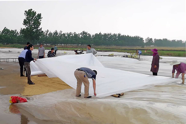 “雨中抢场”,雨急风大,大家推粮的推粮,盖雨布的盖雨布,压边的压边,全然不顾场上细雨纷纷,尘土飞扬,紧张而有序地跟“老天爷”抢时间、比速度。据悉,经过广大干群近40分钟的共同努力,紧急抢场,所有场面夏粮均安全进入了雨布之下……。