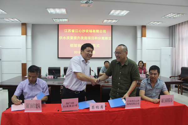沈雪松表示,非常荣幸能够见证江心沙农场改革进程中具有里程碑意义的节点和事件。他说,江心沙从地理位置和感情上来讲,和海门相濡以沫、唇齿相依,是一家人、一体化的。多年以来,场地之间一直相互支持、相互配合,共同促进、共同发展。现根据上级要求,作为住建系统,有责任有义务支持好江心沙的每一项改革。此前,海门市自来水公司与江心沙也进行了多次的磋商,前期工作已基本就绪,到了成熟阶段。今天正式签订框架协议,标志着江心沙供水质量提升改造工程正式拉开了序幕。希望市自来水公司在以后的具体施工过程中,精心组织,按照时间节点,高质量高标准完成场域供水改造工程。