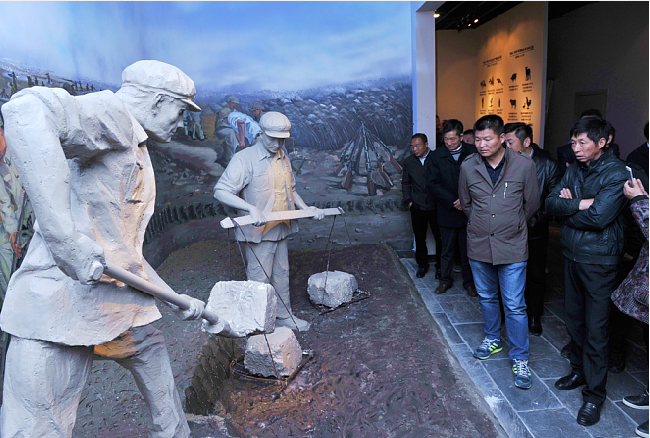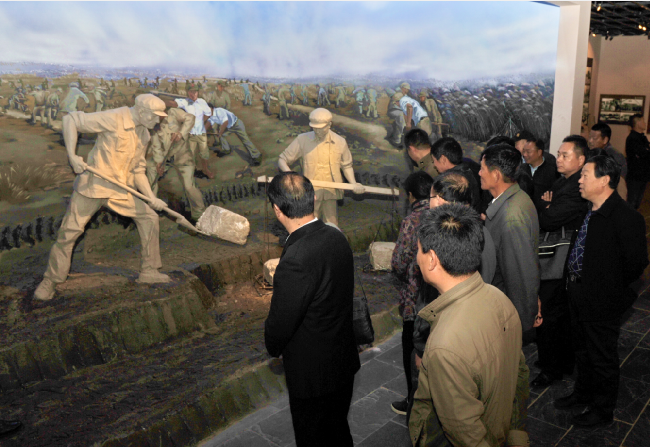 在新征程中勿忘“大锹、扁担”,就是要求我们要接过军垦先辈们的精神接力棒,以脚踏实地的干劲,以舍我其谁的担当,来为了让更多的职工群众能过上美好幸福生活的向往。特别是在时下广泛开展的“不忘初心、牢记使命”的主题教育中,更需要我们深入贯彻党的十九大精神,牢固树立以人民为中心的思想,一切为了人民,一切依靠人民,唯有这样,我们才能在新征程的道路上,无往而不胜。图为客人们在农建四师陈列馆中观看以江希友和仇泉原型创作的“江大锹”和“仇大筐”雕塑模型。