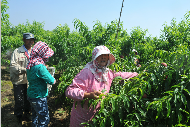 “到农场来干活,距家又不远,而且常年都有事做,家务事又不耽搁,每年很轻松收入就近两万元。”李老汉一边拎着塑料筐跟在妇女后边放着桃,一边跟笔者说着。三四年前,李老汉就开始到果园里来务工,主要从事果树的修剪、施肥、疏花、采摘、锄草、浇水等管理工作。与李老汉那样,仅新东村在果园常年打工的还有其他10多名村民。