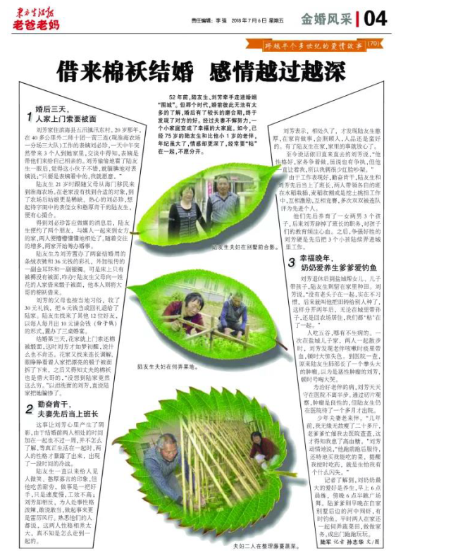 在今天出版的东方生活报四版《金婚风采》栏目上,全版刊登了淮海农场退休老人陆友生和刘芳结婚52年来的爱情故事,这也是该栏目今年以来,第7次以整版的文字和图片形式,刊载淮海老人的爱情故事。现转摘东方生活报上这篇金婚故事,让大家一睹为快。