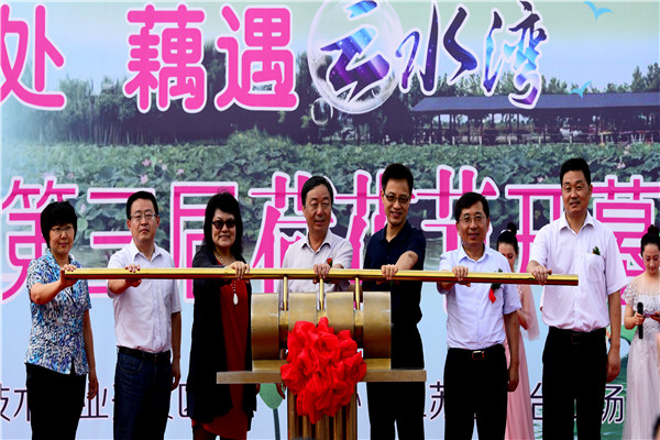 连云港市人大副主任董春科宣布连云港市第三届荷花节开幕,并与省国资委监事会主席李海洋、江苏农垦集团党委委员、总会计师刘克英、连云港高新区党工委书记陈佑龙、连云港市国土局长孔令泰先生、连云港市旅游局长王芬、云台农场党委书记董事长刘卫华共同为开幕式推动启动杆,第三届连云港市荷花节正式开幕,同时,荷文化文艺汇演也正式拉开序幕。