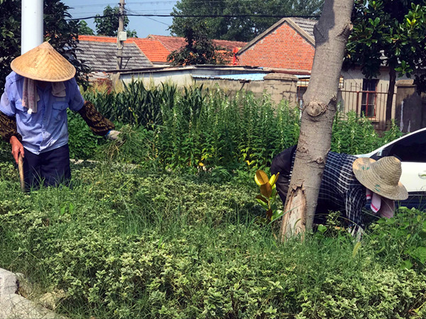 持续的高温,下午二点的室外温度达到38度左右,但在三河场部主干道两侧的绿化岛内,环卫工人们仍然二点准时到岗,由于夏季杂草生长极快,绿化岛内的杂草已经爬上了岛内的观光苗木,为了不影响美感,大家便利用清扫马路之余时间,对岛内的杂草进行人工拔除。8月10日下午二点十分,笔者在农场医院门前的绿化岛内看到,环卫工人们手戴着手套,戴着草帽,由于天气太热,大家都没有戴口罩,而是每人的脖子上围着条毛巾用于擦拭不停从脸上的汗水,衣服已经被汗水浸湿透了,但大家仍然认真细致的在拔除每一棵杂草,并不时的回头看有没有遗漏的。当笔者问他们为什么不避开高温拔除时,一位环卫工人擦擦脸上的汗说,早晚凉时间他们还要清扫马路,时间再不抓紧点,草越长越高就难看了,争取两天时间把两边岛内的草都拔干净,这就是三河环卫工人的情怀,不言苦,不说累,用汗水描绘着三河的每一寸美丽画圈。