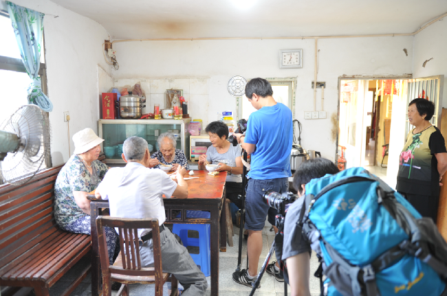 8月20下午-21日,澎湃新闻采访组视频记者朱伟辉、视频编辑龙景和射阳县新闻单位的3名记者在农场宣传部门相关人员的陪同下,用一天半的时间,实时用镜头记载百岁老人从凌晨起床、喝早茶、散步、游玩和吃饭、择菜、做针线活以及与家人、邻居等聊天的情况,感受百岁老人寻常的起居生活。而每拍摄一场老人的生活起居或是生活画面,总是让来自上海澎湃新闻采访组的记者大加赞叹。图为澎湃新闻采访组在拍摄百岁老人生活起居的一组镜头。