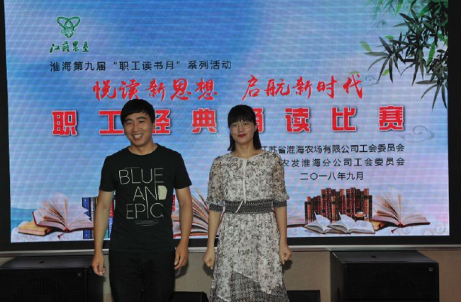 任超荣和栾艳彦作为淮海农场在2013年引进的大学生,两年后在农场土地的滋润下喜结连理,成为来淮海大学生当中为数不多的夫妇,多年来他们在各自的工作岗位上互相鼓励,相互支持,取得了令人满意的业绩,并且近年来他们夫妇一直是淮海工会参与各项文艺活动的积极分子。在淮海工会举办的“悦读新思想 启航新时代”主题活动中,任超龙夫妇俩积极报名参赛,并精心组织材料,利用业余时间熟悉诗篇中主人公的思想境界,并在此基础上夫妇俩一起进行背诵、朗读和动作、效果展示,相互当好各自诵读的第一名观众和裁判,从而也让他们夫妇以较高的分数双双进入第二名。