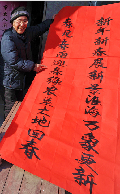 今年春节前夕,葛老特地用书法写了“新年新春展新景淮海万象更新,春风春雨迎春绿农垦大地回春”的诗句春联,让周边邻居看了别有一番风味。