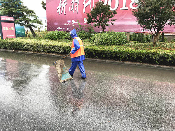 是日,尽管下暴雨,但新洋环卫工人们还是像往常一样,早上六点多就上班了,他们身着雨衣雨裤,外面套着环卫工人工作服,在各自区域行走,雨水一直下,夹着大丰,吹落了树上的叶子,与路上的雨水和在一起,给环卫工人清扫增加了难度,但环卫工人们不辞劳苦,十分认真地清扫干净。到了下午,雨停了,路上的落叶变多了,但环卫工人们没有丝毫抱怨,不厌其烦地再次清扫。