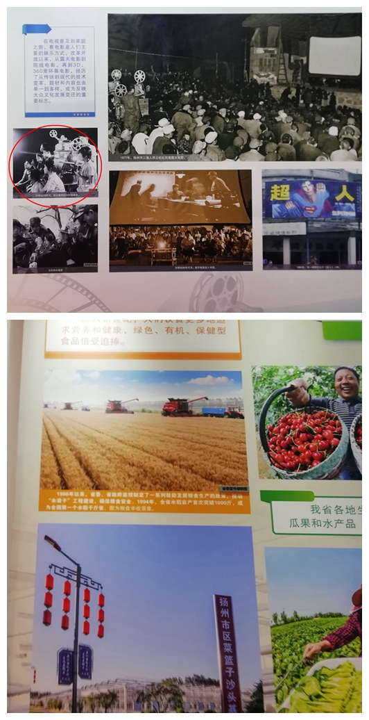 这两张照片分别入选在“历史跨越”和“美好生活”两个部分中,照片没有标明是新洋农场场景,而是从江苏省宏观上来配写文字说明的,说明新洋农场在某些方面带有普遍的意义,这是新洋人感到自豪的。