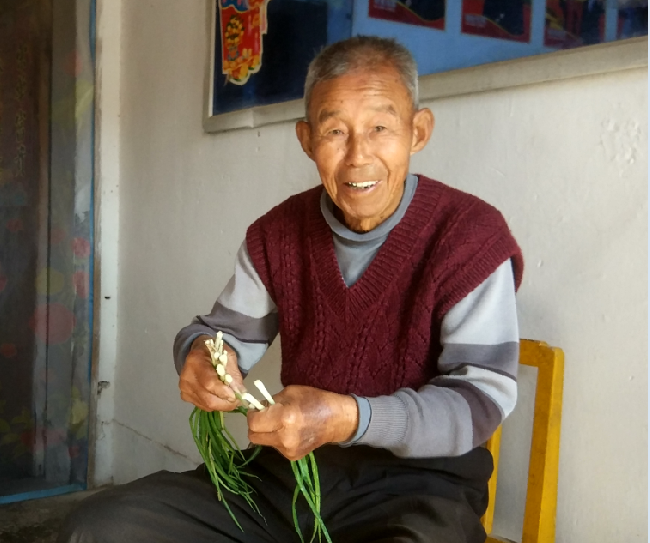 李朋友饮食比较清淡,少肉多素,油盐也不多。每天下午2点左右,他会定时喝些儿孙们孝敬给他享用的脑白金、牛奶等营养品。每月有近7000元的工资,想买什么就买什么,那么多子女一个也不过问,只是由着他怎么处理,但老人从不乱花瞎用。老人很会做人,也会讨儿孙们的欢心,每当他用存单积攒到6万元钱时,就会6个子女一家1万地均分,让儿孙们贴补家用。李朋友对子女出手大方,教育投入上一点也不含糊,一定要他们练好书,学会技能,所以他的子孙都在自食其力地工作,这让李朋友很是欣慰。当然,李朋友在儿孙中威望极高,逢年过节20多个子孙纷纷来到家中团聚,给老人带来孝敬的物品,为老人请安祝福,让老人的晚年生活充满了快乐!图为李朋友老人在做晾被栽菜和择菜时的镜头。