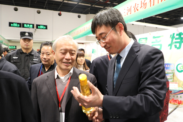 交易会开幕当日,江苏省农业农村工作领导小组副组长胥爱贵等领导巡馆来到江苏农垦展馆,在集团公司企划部负责人和朱明亮的陪同下,专程到临海农场公司展位调研指导。朱明亮向领导介绍,近年来农场公司按照省委和集团公司党委的统一部署,利用资源和组织化优势,推进企业高质量发展,推动产业提档升级,塑造生态健康农副产品。可以生吃的健康油“绿农园”牌牡丹籽油就是公司推出的优质精品之一。胥爱贵说,知道临海农场在射阳县境内,对临海农场公司种植油用牡丹、发展牡丹籽油产业的情况有所了解。他指出,江苏农垦及临海农场公司要在推进现代农业建设和推进质量可追溯的健康农副产品方面发挥示范引领作用;要通过交易会这个平台,推出更多、更好的优质农副产品给上海大众,展示江苏现代农业发展的成就,让上海各界人士更好地了解江苏及品味江苏优质农产品。一同参加巡馆的江苏省粮食局夏春胜局长详细询问了“绿农园”牌牡丹籽油的种植、生产、品牌开发及经营销售等情况。