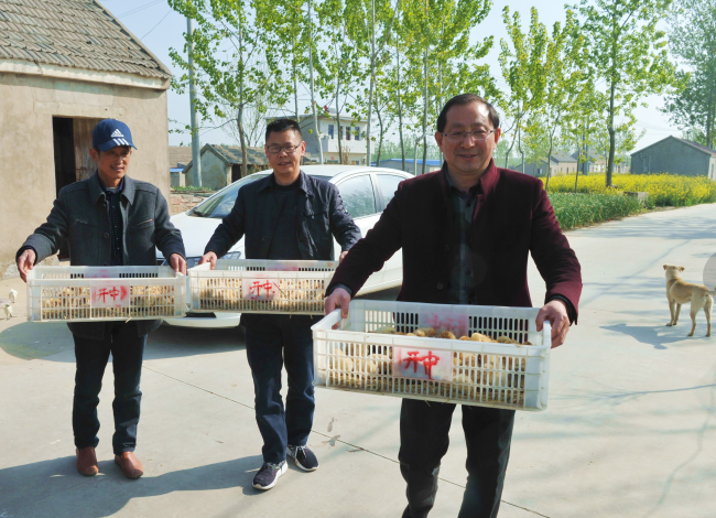 图为农场公司工会及结对帮扶人为王春梅家免费送去雏鸡