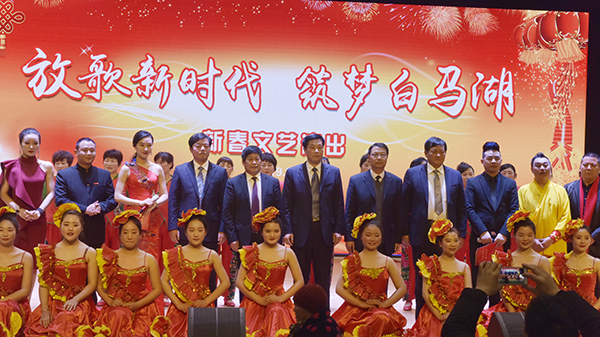 大会紧接着还举行了“放歌新时代、筑梦白马湖”新春文艺演出。姚春华在演出前作了热情洋溢的致辞。来自江苏青春歌舞团的演员及白马湖骏逸舞蹈队的队员们为与会代表及部分职工居民们带来了《盛世龙腾耀中华》《春天的故事》《春雨沐浴白马湖》等十多个精彩的文艺节目,整场演出最后在舞蹈《不忘初心 砥砺前行》中落下了帷幕。