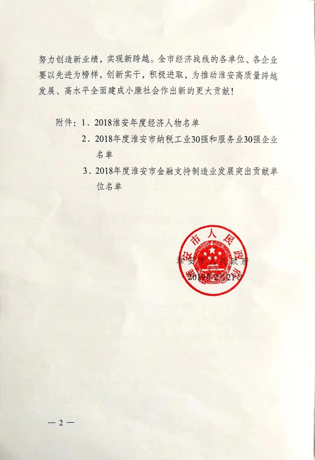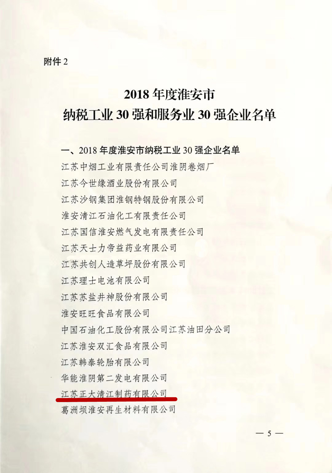 为表彰先进、树立标杆、促进淮安地方经济迈向高质量发展行列,近日,由淮安市人民政府发起和组织开展的“淮安经济人物、淮安市纳税工业30强和服务业30强企业、淮安市金融支持制造业发展突出贡献单位“评选活动在淮揭晓并正式向社会发布,正大清江制药以年纳税额超亿元荣登2018年“淮安市纳税工业30强企业”第15位,至此正大清江制药已连续两年跻身“市纳税工业三十强企业”行列。