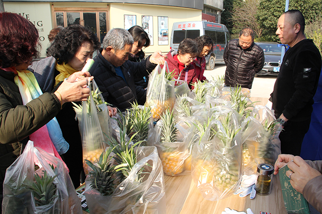 各摊位前人头攒动,争相抢购,“老知青”香粳米、葵王油、海天系列产品、江心沙皓明系列大米、菠萝最抢手,人们买米、买油、买菠萝,拎着沉甸甸的收获,脸上笑开了花。