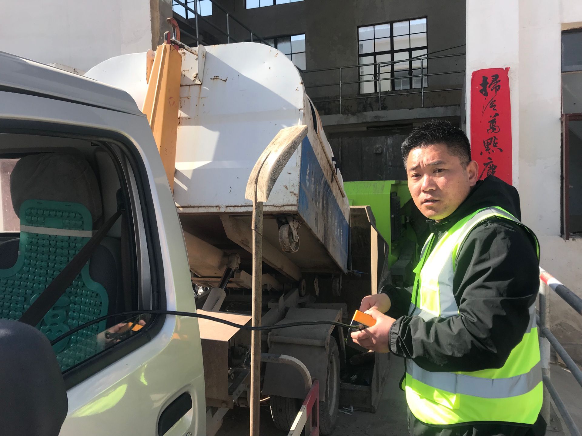 (图为东辛环卫绿化所徐雷正在检修垃圾运输车)