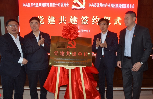 4月29日上午,苏垦南通公司党委与江海镇区党委举办企地党建共建签约仪式。双方领导班子、党组织负责人和部室负责人参加签约仪式。南通市委组织部副部长、市委“两新”工委书记张辉同志和苏通科技产业园区党工委副书记张灵同志应邀出席此次活动。签约仪式由苏垦南通公司党委副书记薛忠同志主持。