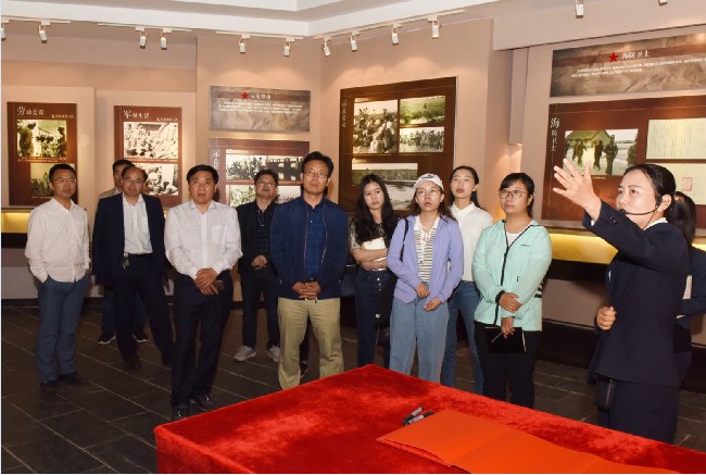 虽然新闻媒体记者一行在淮海农场有限公司参观的时间较短,但通过参观,让采访组一行对农场军垦传统文化感触颇深,感受到了军垦文化的深刻内涵。他们认为淮海的军垦传统文化的素材极为丰富,军垦文化的收集、保护和展示工作做得很好,其内在的教育意义更浓,是一个非常宝贵、不可多得的军垦传统文化传承教育的史实资料场馆。图为“农垦改革发展百场行”垦区巡礼采访组一行在淮海农场有限公司参观时的镜头。