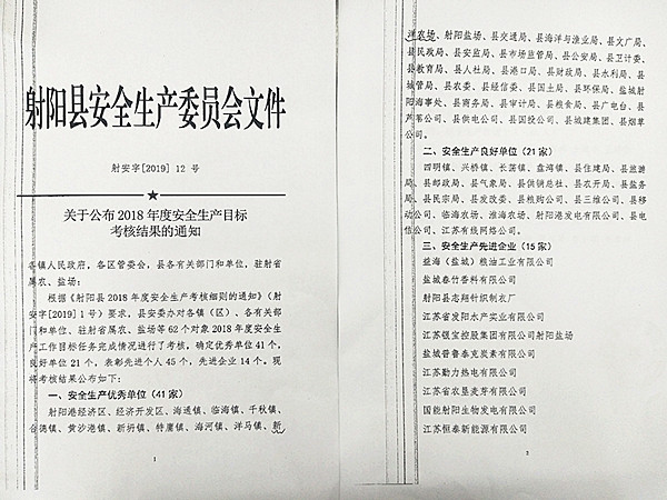 5月27日,射阳县安全生产委员会传来喜讯,在2018年度全县62个对象的安全生产目标考核中,新洋农场被评为2018年度“安全生产优秀单位”,为驻射农场中唯一获此殊荣单位。