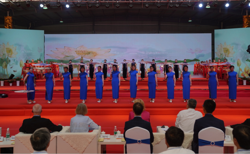开幕式过后,与会领导和嘉宾共同观看了“苏北明珠·美丽黄海”文化活动展演。龙鼓、太极、功夫扇、旗袍秀组合表演《激情6月》、少儿足球操表演《我健康 我快乐》、古筝、古琴、茶艺、古典舞蹈表演《盛世琴韵》,示范园内欢歌笑语、载歌载舞,见证了第五届田间日的成功举办,用文化盛宴精彩展现了“苏北明珠·美丽黄海”。