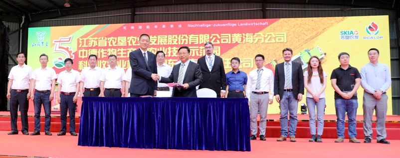 中德示范园主任贺在锐与科乐收农业机械(山东公司)首席执行官分别代表中德示范园与科乐收公司签署合作协议。