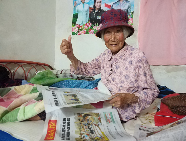 在6月20日出版的盐城晚报城事栏目上,一条以超出半版篇幅的《射阳百岁老人爱劳动闲不住》的人物新闻显著亮相六版的关条上,当淮海百岁老人邱维珍拿到写有自己报道的报纸时,开心地说:“没有想到我的寻常生活也能刊登在报纸上,太高兴了!”说完,边看着报纸上自己和家人的照片,边举起大拇指夸赞着。