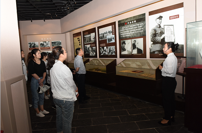 6月28日,在农建四师大院内一座大理石碑前,农建四师陈列馆讲解员王超男正在给来这里进行红色传统和廉政文化教育的建湖县委组织部部机关的人员讲解军委主席毛泽东向102师全体指战员签署“生产待命、建设农场”的碑文。