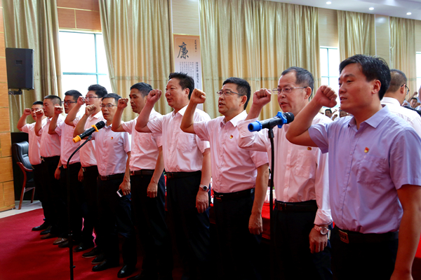 会上,党委书记王信学及领导班子成员和在场全体共产党员重温入党誓词。在辛晓利同志领誓下,全体同志面向党旗,举起右拳,庄严宣誓:我志愿加入中国共产党,拥护党的纲领,遵守党的章程,履行党员义务,执行党的决定,严守党的纪律,保守党的秘密,对党忠诚,积极工作,为共产主义奋斗终身,随时准备为党和人民牺牲一切,永不叛党!