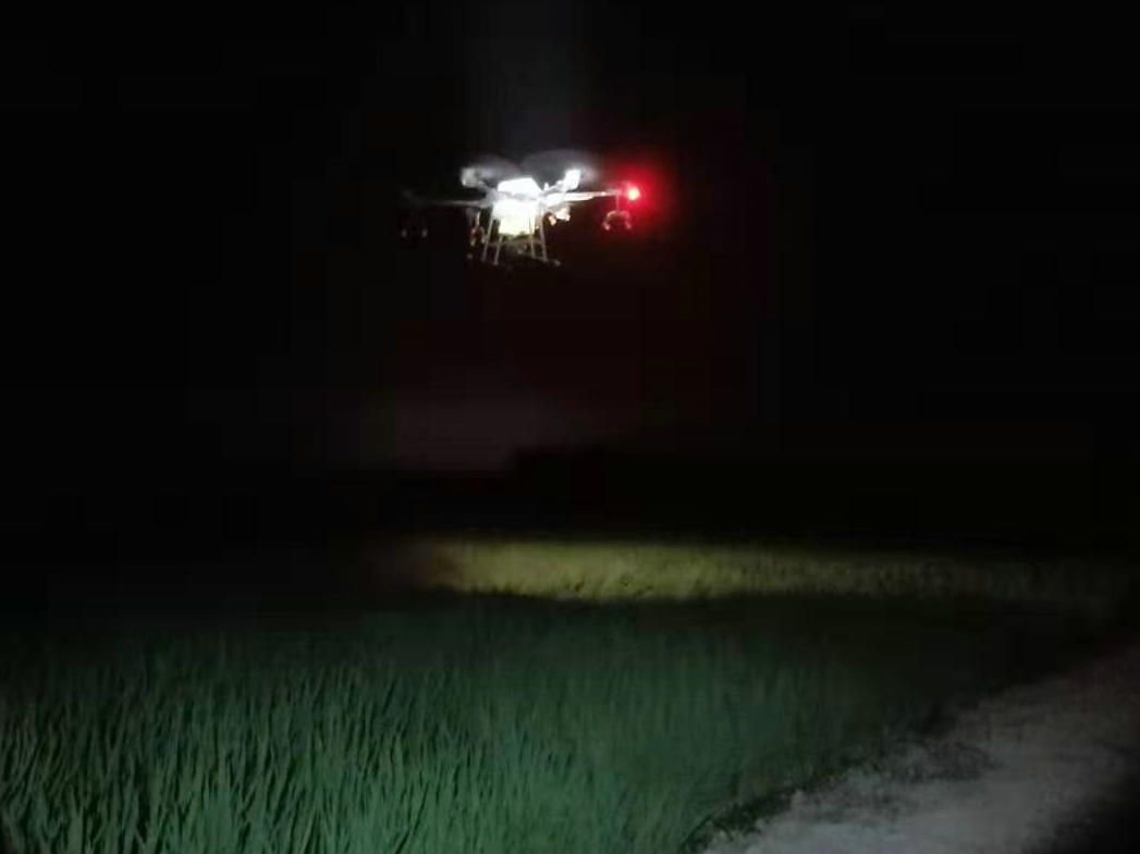 7月25日夜晚,宝应湖分公司共和生产区水稻田里,点点红光闪烁,与荧火虫共舞,原来是植保飞机正在给稻田喷洒药物。