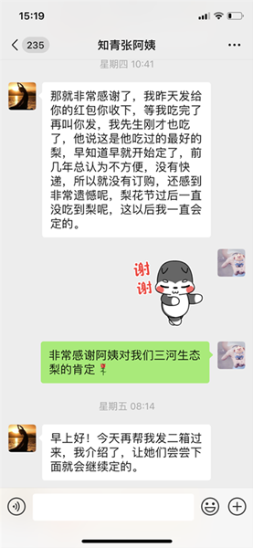 “三河优质梨具有皮薄、汁多、核小、味甜等特点,含有丰富的维生素,可延缓衰老,具有较强的抗氧化性,有防癌、抗癌的功效。 生态梨园坚持施用有机肥、人工除草、绿色无公害等精细化管理措施,使三河梨的品质更上一筹,目前梨已经通过国家绿色食品认证,实现了梨生产全过程质量可追溯”。老知青们将三河好梨的这些特点熟记于心,并向各自的亲朋好友积极宣传推介。