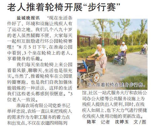在8月8日刊登的盐城晚报上,刊登了淮海三位老人推着轮椅在公园中开展“步行赛”的图片新闻,感觉到轮椅老人在淮海公共环境下的便利生活,叙述着农场社区的发展和变化。