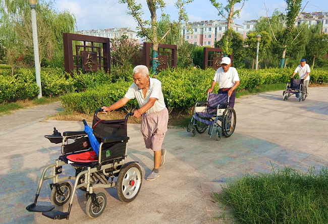 我们每天坐在轮椅上来公园看看风景、聊聊天,生活也是很充实。当然了,推着轮椅车在公园里转圈赛跑,也是我们自我加强体能锻炼的一种活法,这样的生活我们这些老头都感到很惬意。”3位老人一致说。