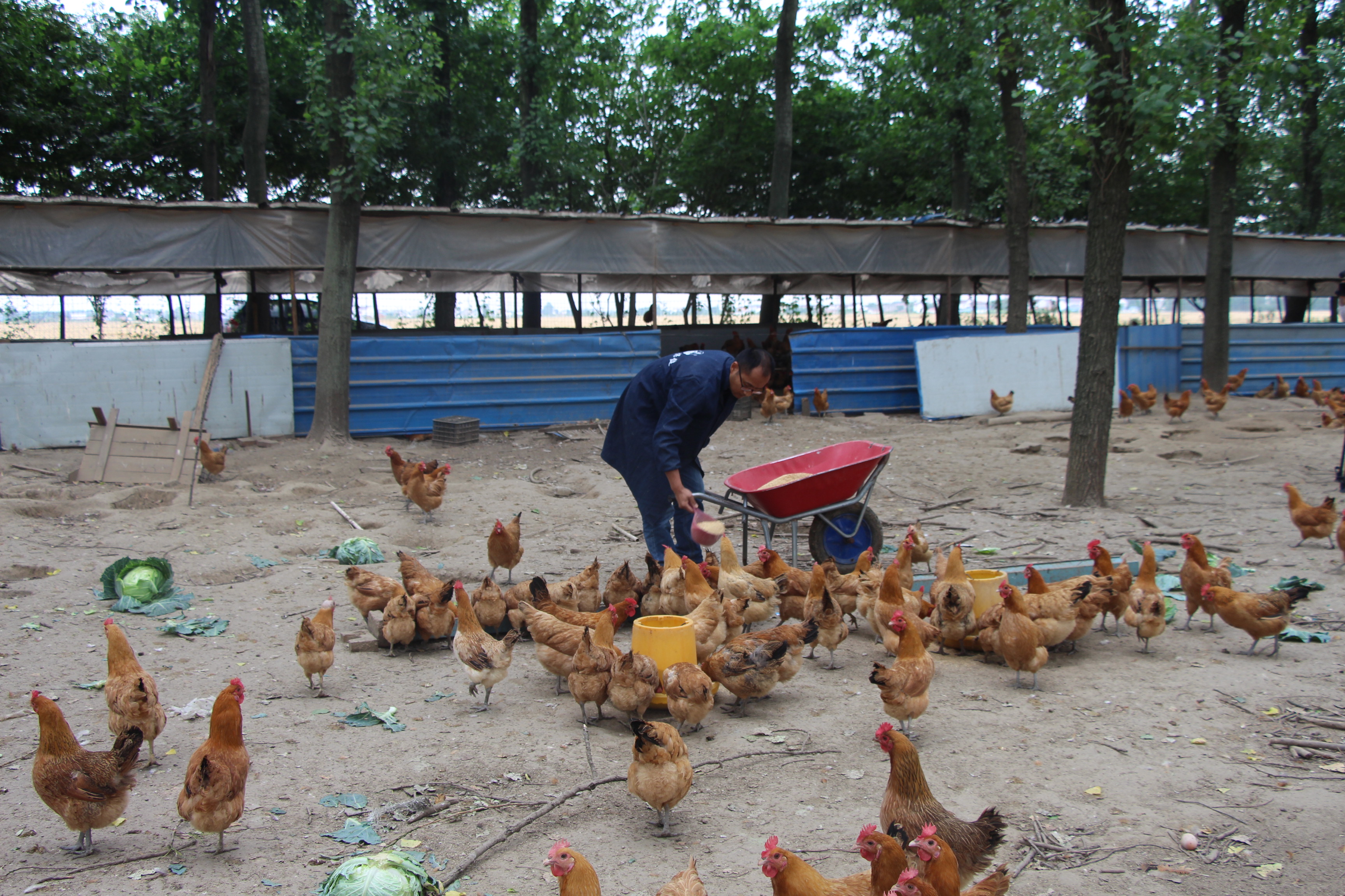 海安农场场部的南边是农场三大队,走进三大队,一片树林便映入眼帘,不远处听到连绵不断的鸡鸣声,走近一看,原来是一个林下养鸡场,鸡场的主人是一位年仅36岁的年青人,他名叫田佳斌,来自如皋市江安镇。