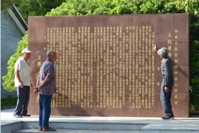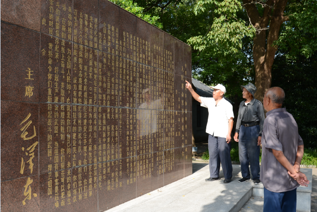 像胡铁成这3名老兵,在淮海目前只有200多人了,我们从他们的穿着、他们的行为举止上,依然看到当年农建四师将士们艰苦奋斗的身影,他们就是当年历史的“活化石”,经常陪伴着这里他们生长和战斗过的地方。每当有人来这里参观或受邀为新进大学生、学校学生进行传统教育时,他们也会走上前或欣然向往,真挚地向后人讲述着曾经的军垦故事、传统文化和其蕴含着博大精深的军垦精神。图为老兵在农建四师纪念碑和毛泽东命令碑文前的镜头。