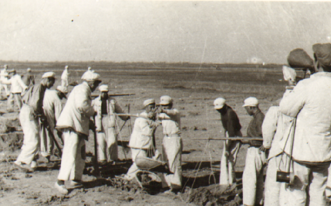 队伍出发了!迎着雨,顶着风,踏着泥泞的道路奔赴工地,到达目的地后,同志们立即就在风雨中与黄土“开火”!雨越下越大,风越刮越凶,每个同志从头发到脚跟都被雨淋湿了,淤泥粘住锹头,地下水位很高,挖一块泥很吃力。虽然,有水车可车水,面盆可戽水,但是沟底的水老是渗出来!战士们把淤泥从河底向岸上扔,力气小的扔得近,又从坡子旁滚回沟里,这些困难吓不倒英勇的人民战士。图为当年农建四师官兵在水利工地上战斗的镜头。