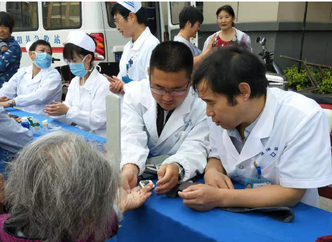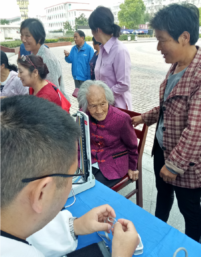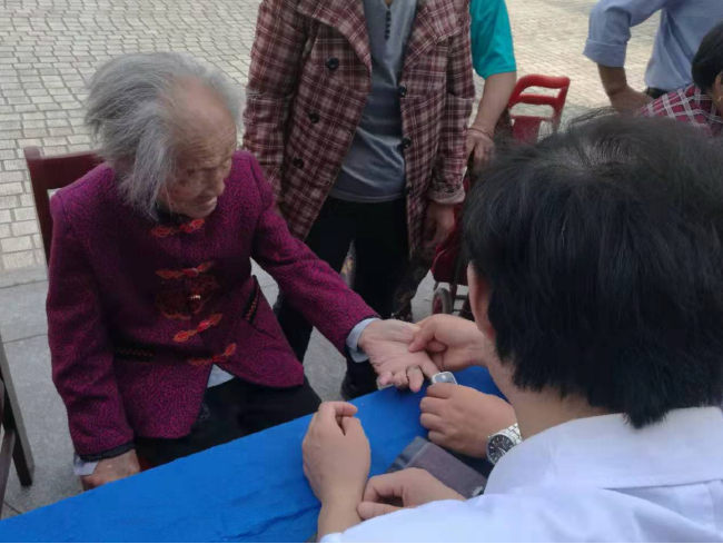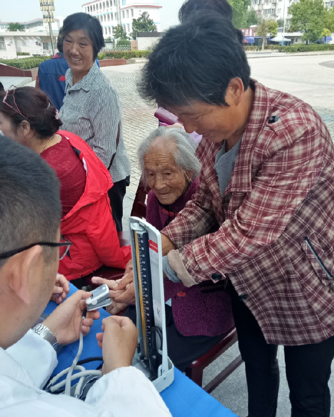 9月24日上午,淮海农场医院10多名医护人员组成的2019年健康江苏服务百姓大型义诊活动,在淮海农场文化广场上拉开的帷幕。来自农场社区群乐小区的百岁老人张瑞瑞在女儿的陪伴下,也赶到社区参加了当天的义诊活动。农场医院的两名主任医师对百岁老人进行测血糖、测血压、心率和指脉氧测定等内容,并询问了老人平时的生活起居情况,老人的女儿还对与母亲相关的疾病知识现场与医生进行了咨询沟通。