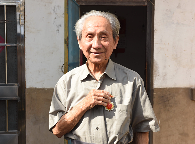 昨天下午,家住淮海农场朝阳小区老干部楼95岁高龄的叶崇山老人,依然沉浸在新中国成立70周年的喜悦之中,因为前一天,淮海农场有限公司党委书记单祥忠特地来到叶老的家中,并向老人家递交了“庆祝中华人民共和国成立70周年”纪念章。