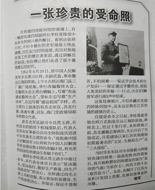 在10月8日出版的老年周报上,刊登了《一张珍贵的受命照》,展示了农建四师副师长李桂莲在海门三厂镇举行的改编大会上,接受毛泽东命令时的镜头。全文刊登如下。