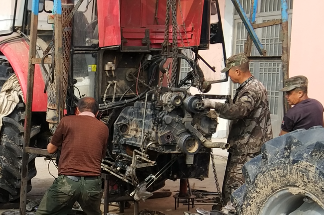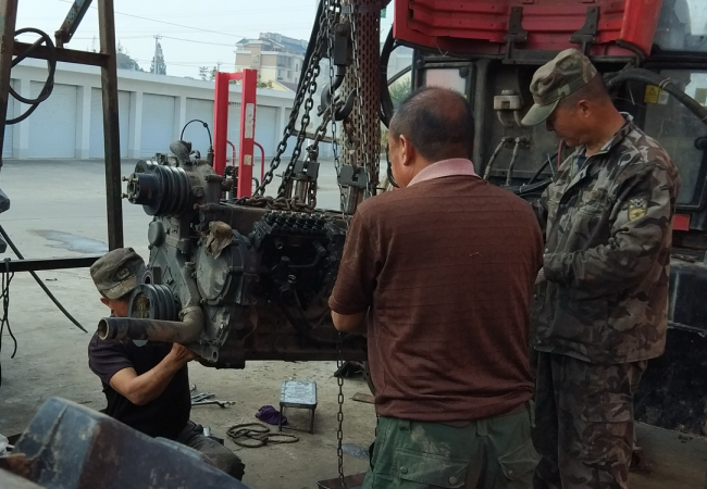 今年“三秋”开始以来,为保障农机更好地服务农业,该农机修理所以提供配件和抢抓修理为主业,既上门或到田间地头进行抢修,又接受广大农机户上门修理农机业务,同时也无偿地为广大农机户提供技术咨询、电话医生等服务,以站在农机户的角度上思考问题,尽可能地缩短农机手等待农机配件或是修理的时间,千方百计并加班加点地为广大农机户提供方便。为节约时间,他们的中晚餐全交由快餐店来经营,夜晚更是加班加点地挥汗如雨抢赶进度。他们正是以诚信经营的理念和优质的服务质量,受到了农场有限公司及周边广大农机户的支持和欢迎。图为李贵等四兄弟在抢修农机时的镜头。