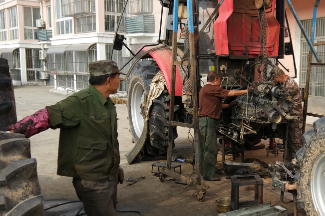 在淮海农场神禾路东侧一座平房前,我们见到有四名农机修理师傅正在维修在三秋作业中出现故障的农机,多年以来,他们四人一直以抱团的形式开了这个农机修理点,这对在三夏三秋中讲究时间速率的农机手们来说,收获了许多农机修理订单,他们在帮助别人的同时,也让自身获得了不菲的收益。这四个人就是农场原农机修理厂李贵3兄弟和孙文贵等4人。