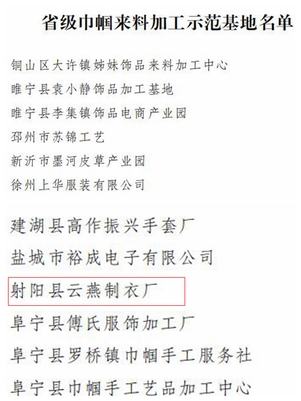 为深入学习贯彻党的十九大精神,全面落实省委省政府系统化推进高质量发展的部署,组织动员广大妇女积极投身乡村振兴巾帼行动,培树巾帼创业创新的先进典型,省妇女“双学双比“竟赛活动领导小组于年初在全省开展了省级巾帼示范基地创建活动。经自主申报、市县推荐、专家评审、网上公示等环节,射阳县云燕制衣厂在评选中脱颖而出。