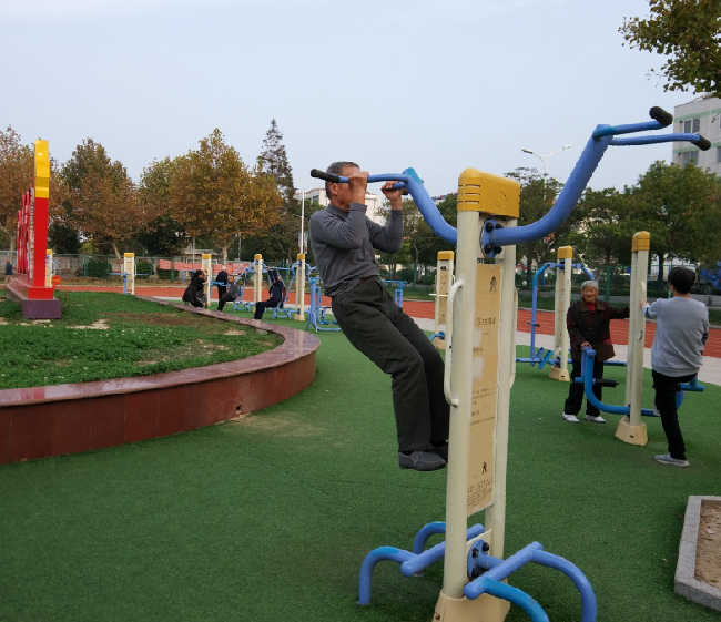 在淮海农场职工休闲体育运动广场的健身器材上,一位头发花白的老人双手拉着双杠,头朝下腿朝上,双腿缓慢上抬,直到伸直为止,一个固定的动作能撑上几分钟。该老人名叫周少彪,今年88岁,他是江苏射阳县淮海农场社区城南居委会的居民,这是笔者看到的情景。不仅如此,已经88岁高龄的他,还就地撑上十几个仰卧撑、在塑胶跑道上进行双腿交叉跑等高难度动作,其身体的柔软程度令人惊叹。