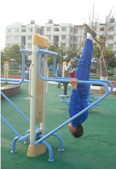淮海农场职工休闲体育运动广场的健身器材上,一位头发花白的老人双手拉着双杠,头朝下腿朝上,双腿缓慢上抬,直到伸直为止,一个固定的动作能撑上几分钟。该老人名叫周少彪,今年88岁,他是江苏射阳县淮海农场社区城南居委会的居民,这是笔者看到的情景。不仅如此,已经88岁高龄的他就地撑上十几个仰卧撑在塑胶跑道上进行双腿交叉跑等高难度动作,身体柔软程度令人惊叹。