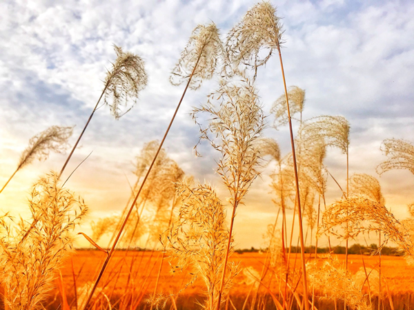 当收割机的出粮筒将颗颗鼓鼓的稻粒往卡车里卸时,我忍不住迎着漫天纷飞的稻叶屑按下快门,拍下这令人兴奋的瞬间,任稻叶屑刺痛我的脸颊,吹的我睁不开眼,可我却十分喜欢这种感觉,享受这个过程,这种境界,好似这大片的金黄只属于我,我特别喜欢这景色,美的让人无法用文字来表达,穿过一片片稻田,和不时从身边经过的农业职工打招呼,他们都会对我说,下来采风的啊,今年可要好好拍拍噢,我笑着应答,那是必须的,我能感觉到他们内心的喜悦,一年的辛勤耕耘和付出,能有如此的回报是他们再心慰不过的了,我替他们高兴,更为他们今年的收获而欢欣。田边路两旁的芦苇今年长的也是特别的好看,飘荡在半空中,与远处的一片金黄形成了鲜明的色差,将稻田映衬的金碧辉煌般如同洒满了一地的黄金,好久没有看到如此令人兴奋的景色。