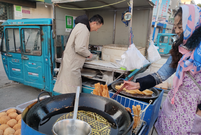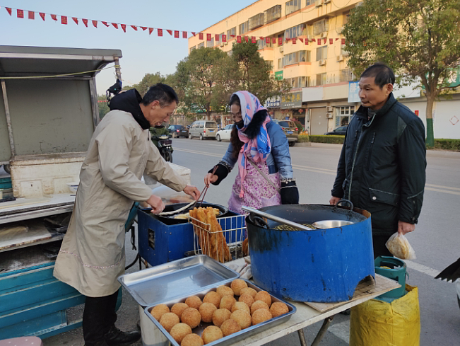 几个月前,当姜建彪听说以前一直在街头制作油条麻团的农场职工徐传彪打算改行要外出时,姜建彪便找到他学习制作油条麻团的技艺,并把他练摊用的车辆等家什盘了下来。早晨练摊,虽说起的早些,但不影响照顾老人和妻子打工。丈夫弄面食,妻子在一边帮工,兼做收钱服务等工作。由于他们全是农场熟悉的职工,所以每天的生意也很红火,大家也愿意照顾他们的生意,这让姜建彪夫妇很是开心,更加激发了他们摆好摊子,服务大家的决心。