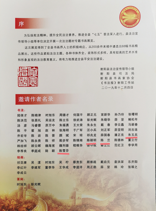 12月4日是国家宪法日,为弘扬宪法精神,推进国家治理体系和治理能力现代化,射阳县开展了一次法治题材专题书画展览。新洋4名资深书法爱好者陈颖明、朱玉兵、陈兰、陈雪芬的作品成功入选书画展。