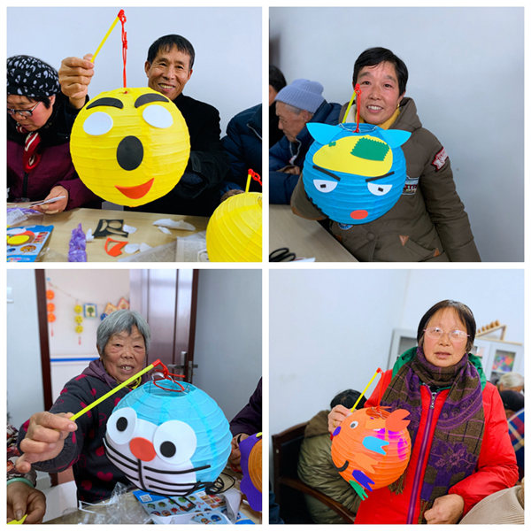 活动开始前,工作人员先讲解了灯笼的由来及灯笼的意义并把制作灯笼的材料发到大家手中,接着向大家详细讲解了灯笼制作的步骤。在中心工作人员的协助下,老人们纷纷动起手来,大家分工有序,合力DIY制作灯笼,整个活动室内热闹非凡,在一片欢声笑语中,很快一只只可爱又萌萌哒的灯笼便闪亮登场了。“你们看,我这灯笼上有个青蛙,你那是灰太狼的,哈哈……”