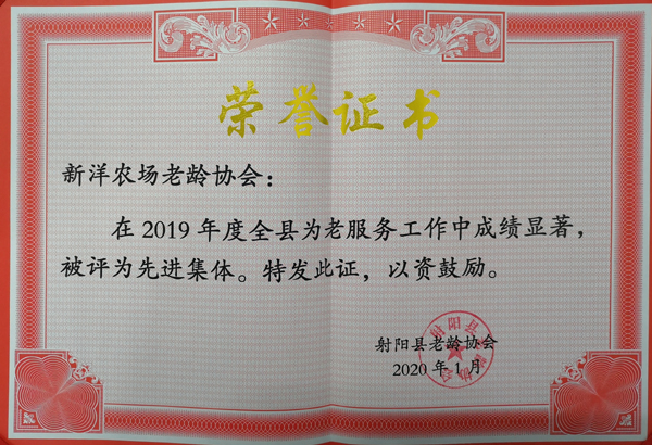 在2019年度射阳县为老服务工作表彰大会上,新洋荣获“2019年度为老服务先进集体”称号。老年工作得到了县老龄协会的特别表扬。